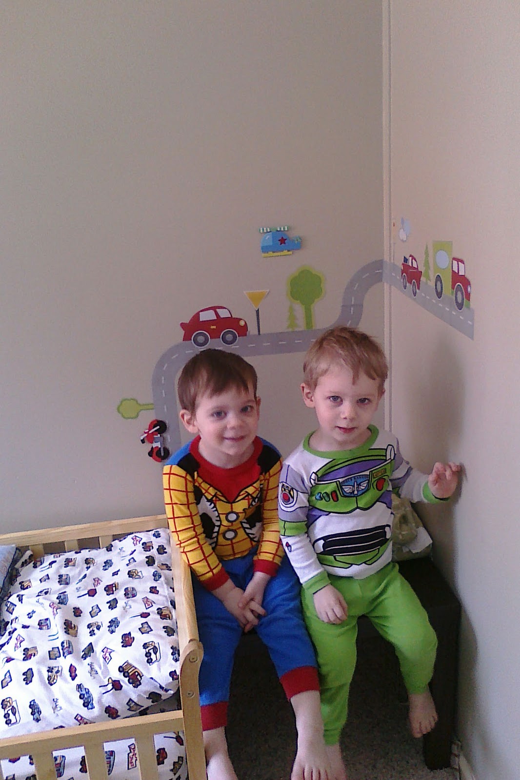 I finally got up the courage (and patience) on Sunday to hang the cute wall decals in Ben's room that Gigi gave the boys for Christmas. They match their cute Target bedding. Ben was so excited about his new "stickers."